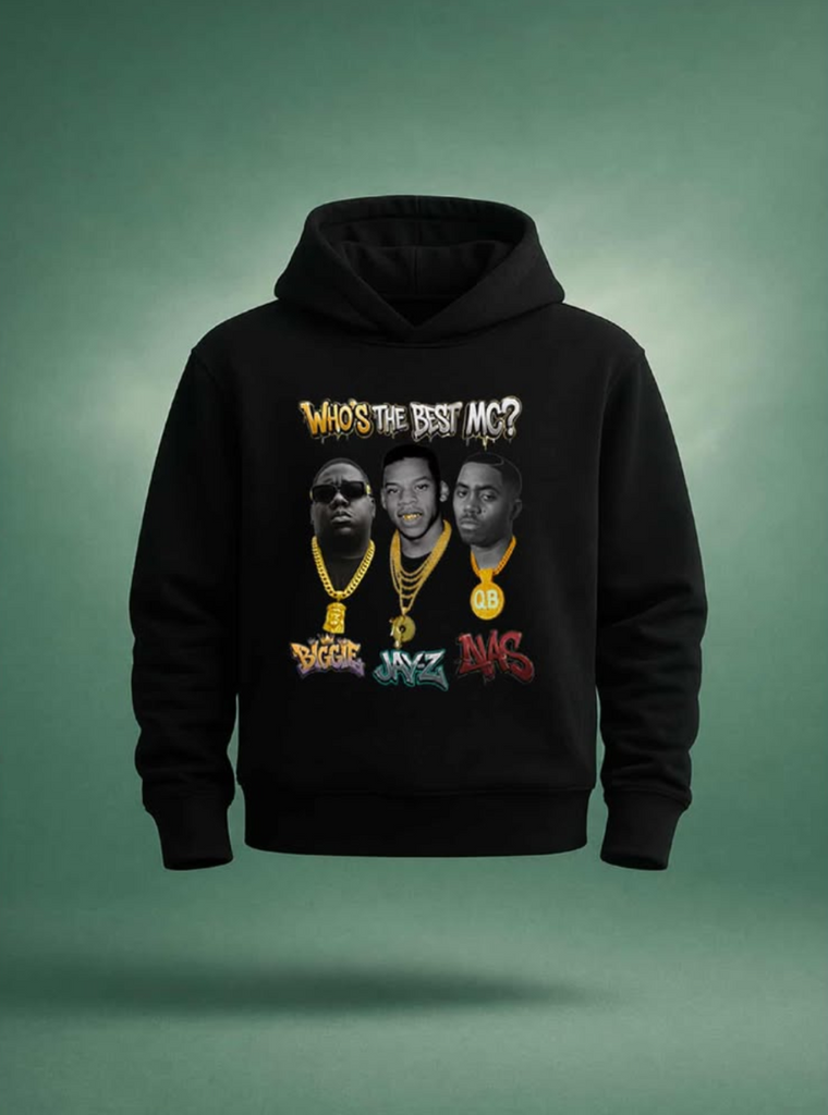 The “Who’s the Best MC?” T-Shirt celebrates three kings of New York of hip-hop’s most influential voices, bringing classic rap culture straight to your wardrobe. Featuring a bold, high-contrast graphic on a deep black tee, this design blends street style with hip-hop history—perfect for fans who know bars matter.