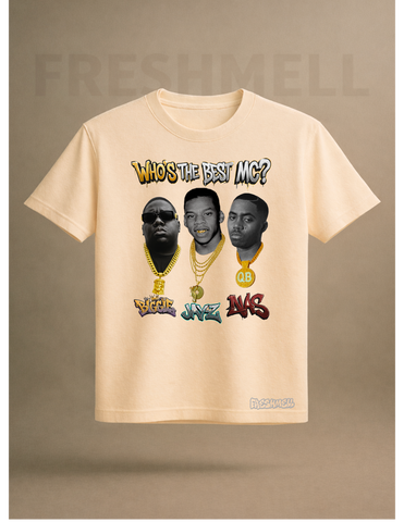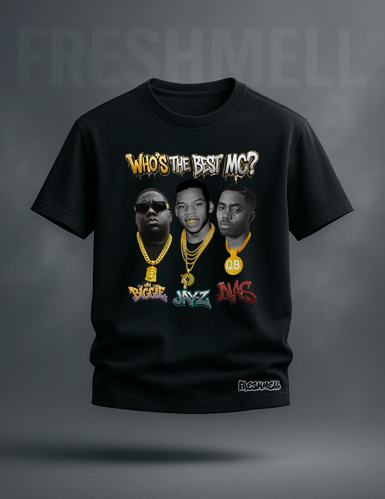 The “Who’s the Best MC?” T-Shirt celebrates three kings of New York of hip-hop’s most influential voices, bringing classic rap culture straight to your wardrobe. Featuring a bold, high-contrast graphic on a deep black tee, this design blends street style with hip-hop history—perfect for fans who know bars matter.